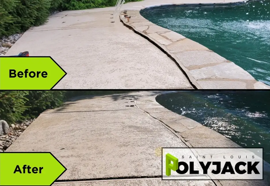 Sometimes uneven pool decks are connected to other settling concrete around the property. If you are noticing similar issues in multiple areas, Saint Louis Polyjack also provides driveway leveling, garage floor leveling, walkway and sidewalk leveling, and patio leveling. In some cases, soil movement can also create empty space beneath the slab, which may require void filling to restore proper support.